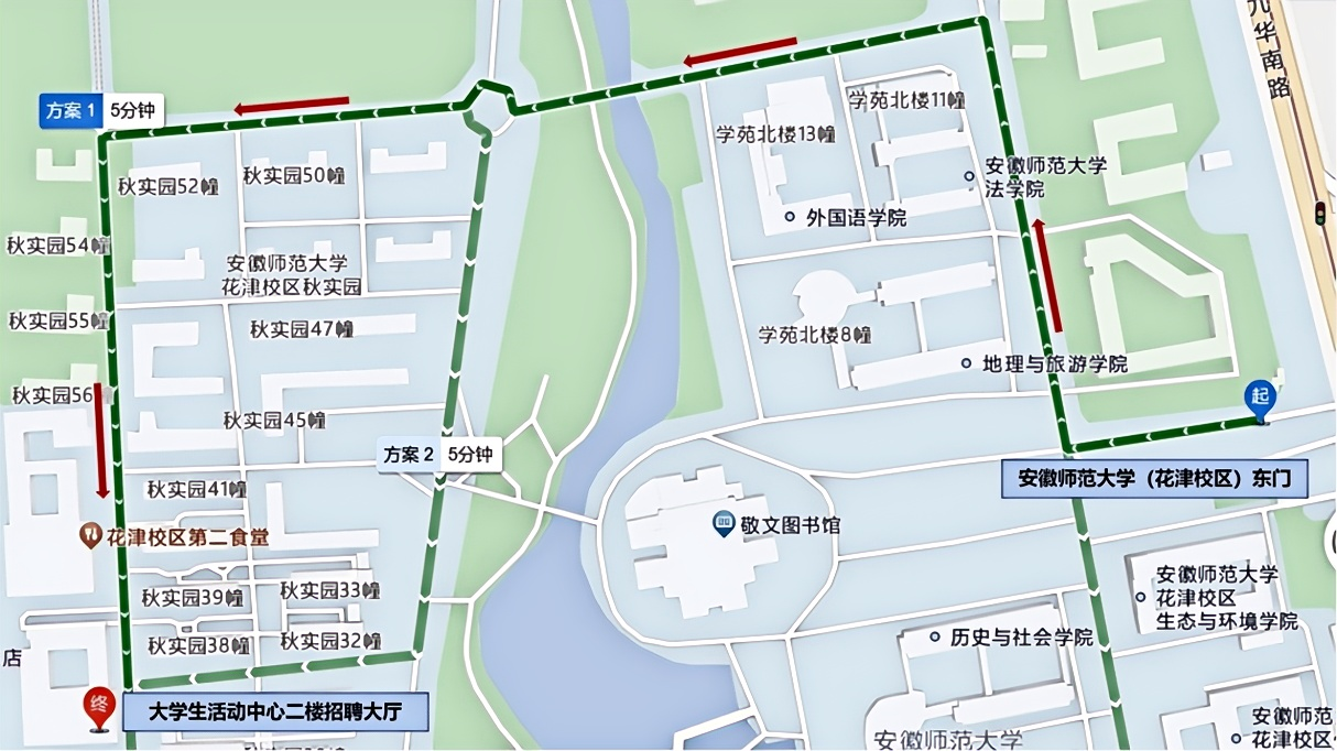 我校为用人单位开通专门进校通道,车辆请从芜湖市九华南路东大门进入花津校区校园。招聘会举办地址:安徽师范大学花津校区大学生活动中心。
